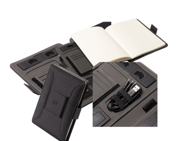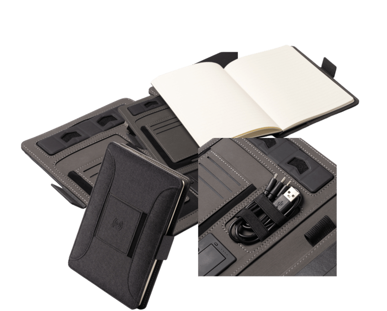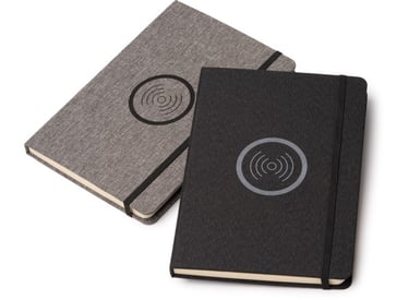 Bloc de notas tamaño A5 elaborado en tejido RPET con superficie de carga inalámbrica de 15W para dispositivos móviles. Cuenta con puerto tipo C para conexión de carga y cierre elástico del bloc.