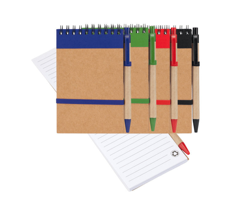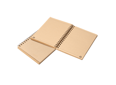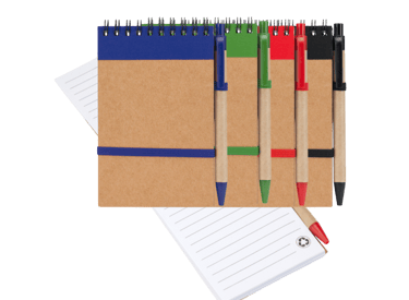 Libreta con espiral y tapa rígida de cartón reciclado. Incluye bolígrafo a juego con tinta azul. 70 hojas.