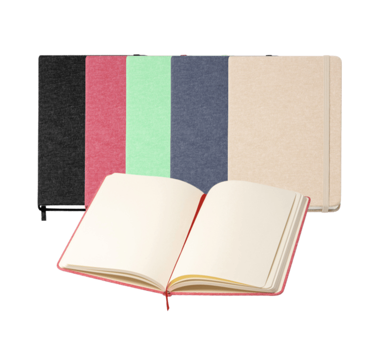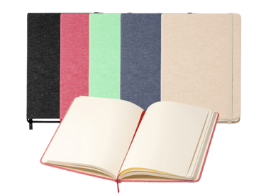 Bloc de notas A5 con tapas en algodón reciclado. Marcapáginas y banda elástica. 100 hojas lisas. DISPONIBLE EN 5 COLORES.