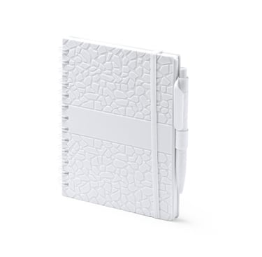 Libreta A5 realizada a base de estractos de piedra. Tapa rígida y doble anilla. Soporte con bolígrafo a juego. Tinta azul. 70 hojas a rayas. INCLUYE BOLLÍGRAFO.
