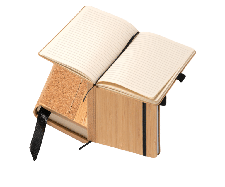 Libreta A5 con tapas de bambú y corcho. Soporte para bolígrafo. Marcapáginas y banda elástica. 80 hojas rayadas.