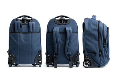 Trolley convertible en mochila. Realizado en poliéster 300D vigoré. Bolsillo principal de gran capacidad con compartimento interior acolchado ideal para portátil de hasta 17". Dos bolsillos con compartimentos interiores y bolsillo frontal. Estructura de alta calidad y resistencia. Tiras acolchadas ajustables. Fundas cubre ruedas antimanchas. Apta para cabina. Disponible también en negra.