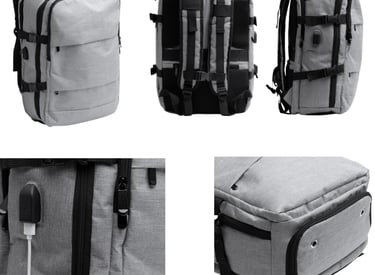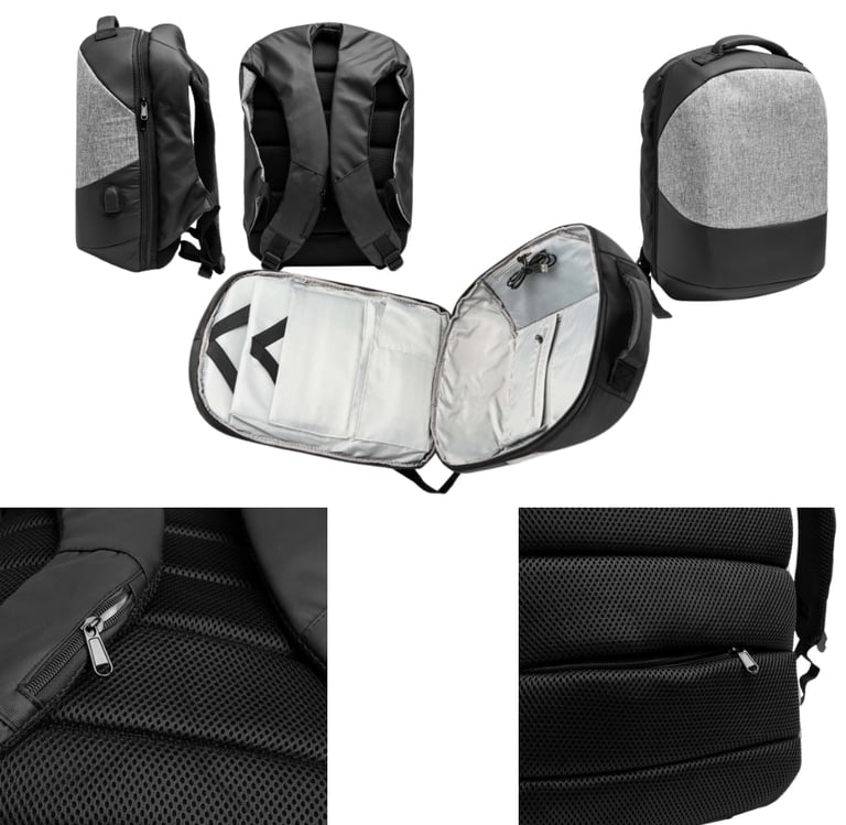 Mochila antirrobo realizada en nylon. Compartimento con salida USB para conectar un Power Bank (no incluido). Incluye cable micro USB. Bolsillo multiusos en tira derecha. Bolsillo principal con dos compartimentos acolchados ideal para portátil y Tablet.