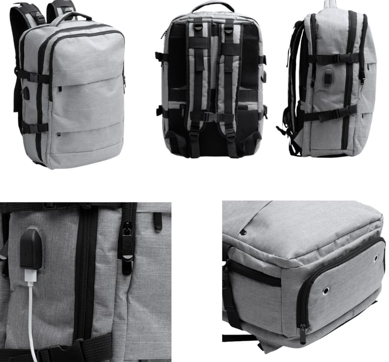 Mochila de viaje realziada en poliéster reciclado RPET, diseñada para comodidad y funcionalidad. Cuenta con espalda y asas acolchadas, 2 bolsillos exteriores frontales y 3 amplios compartimentos principales. Incluye un compartimento acolchado para portátil de 17,3", salida USB con cable micro USB para conectar un Power Bank (no incluido), y un compartimento transpirable para zapatillas. Con bolsillo antirrobo en la parte trasera y cinta para trolley, ofrece una capacidad de 30 litros para viajes organizados y seguros. Disponible también en color negro.